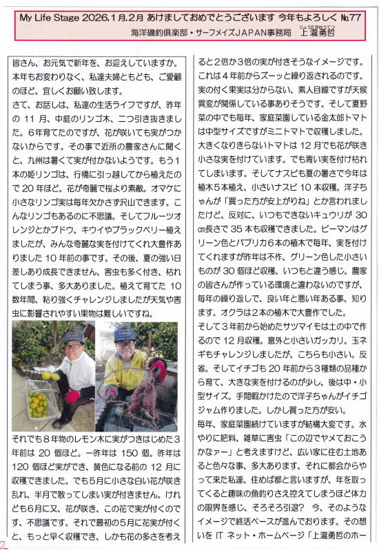 そのような心構えで、今年も一つでも多く、自己満足できる事を切磋琢磨し、社会とか、釣界発展に伴うアクションを、熱望しながら、出来るところで頑張ります。その上で、皆様との交遊、今後とも、妻の洋子ちゃん共々、応援して下さい。宜しくお願い致します。